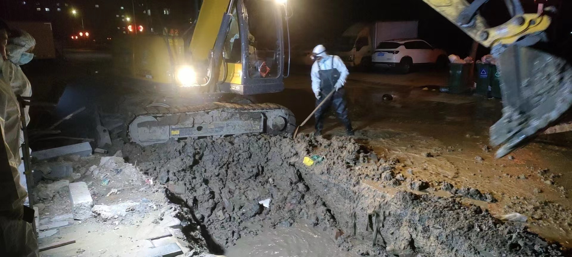 3月15日晚9點(diǎn)多,鲅魚(yú)圈分公司接到宋屯小區(qū)物業(yè)的求助電話(huà),小區(qū)內(nèi)主路有大量積水,疑是自來(lái)水管道漏水,宋屯小區(qū)全部停水,分公司維修隊(duì)全體成員在隊(duì)長(zhǎng)唐有的帶領(lǐng)下,迅速做好個(gè)人防護(hù),對(duì)人員和設(shè)備及材料進(jìn)行消殺后,第一時(shí)間奔赴漏水現(xiàn)場(chǎng)。經(jīng)詳實(shí)探查發(fā)現(xiàn)是通往宋屯小區(qū)的供水DN900mm主管道管網(wǎng)漏水,現(xiàn)場(chǎng)電、氣、通訊等各條線(xiàn)路縱橫交錯(cuò),給搶修工作帶來(lái)巨大不便,唐有和隊(duì)員們迎難而上,在零下10多度的低溫下輪流上陣,用鐵鍬一點(diǎn)一點(diǎn)掏挖出操作空間。厚重的防護(hù)服、護(hù)目鏡等防護(hù)用具使搶修人員們的動(dòng)作顯得有些笨拙,憑借著豐富的搶修經(jīng)驗(yàn),夜里12時(shí)許將漏點(diǎn)挖出,直至凌晨1點(diǎn)半,恢復(fù)了宋屯小區(qū)的正常供水。